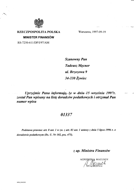 Owner of the “PIONIER-PODATNIK” Consulting Office is a tax adviser and has: