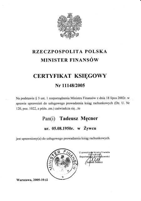 “PIONIER-PODATNIK” employs specialists, whose professional experience and education guarantees the highest quality of services. Employees are certified by the Minister of Finance for bookkeeping services registered under the numbers 30516/2008 and 40445/2010 and proper certificates in the field of EU grants.